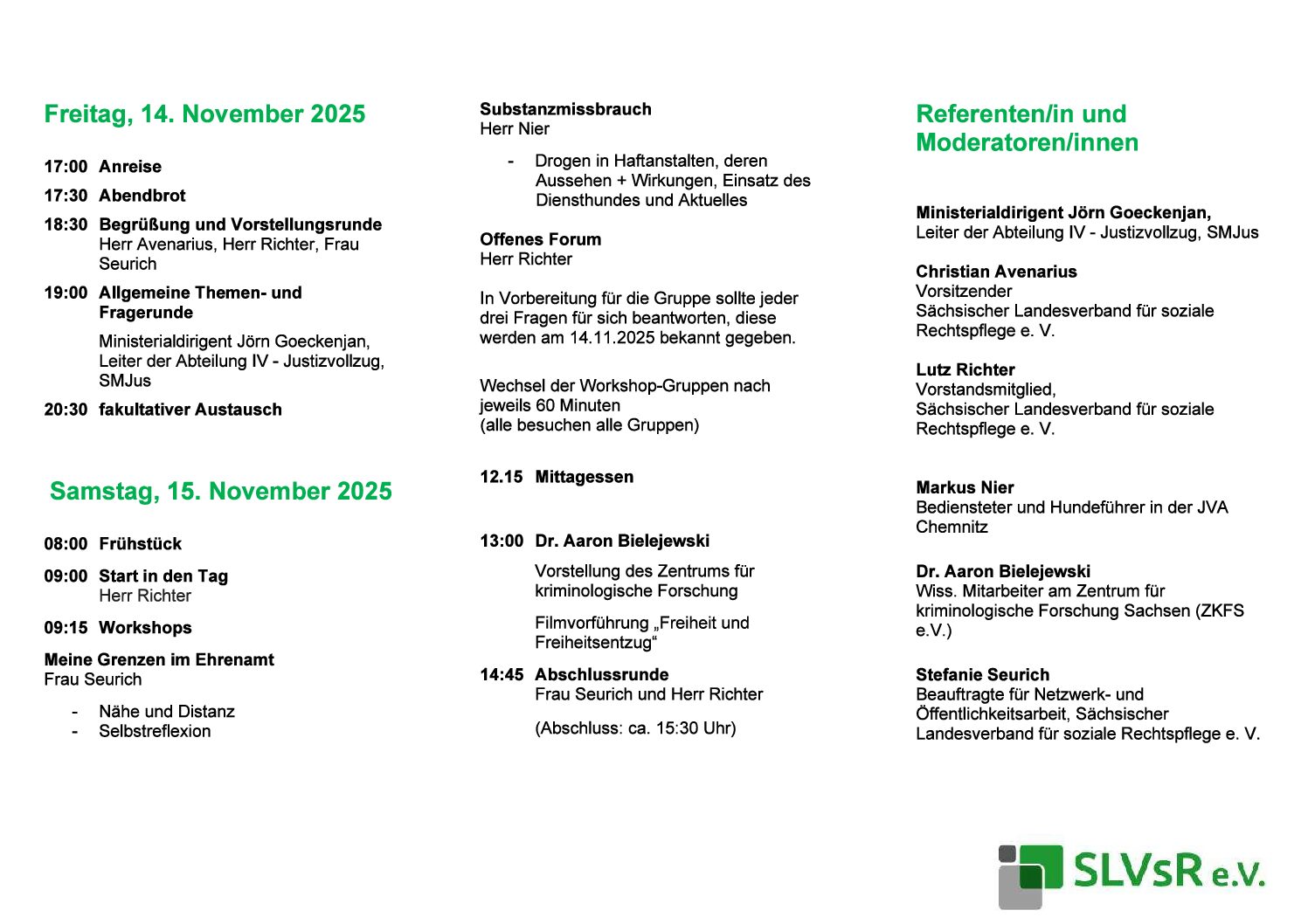 Der Landesverband bemüht sich in Kooperation mit dem Sächsischen Staatsministerium der Justiz (SMJ) eine jährliche Wochenendtagung im Ausbildungszentrum in Bobritzsch umzusetzen.